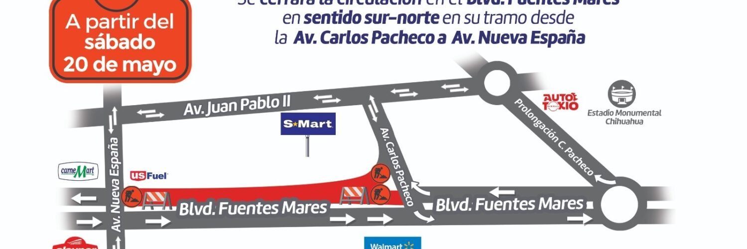El Gobierno Municipal anuncia que a partir del sábado 20 de mayo serán cerrados los carriles de sur a norte del boulevard Fuentes Mares, a la altura de la avenida Nueva España, por el arranque de construcción del Paso Inferior del Distribuidor Vial por parte de la Dirección de Obras Públicas, por lo que exhortan a la población tomar vías alternas.
