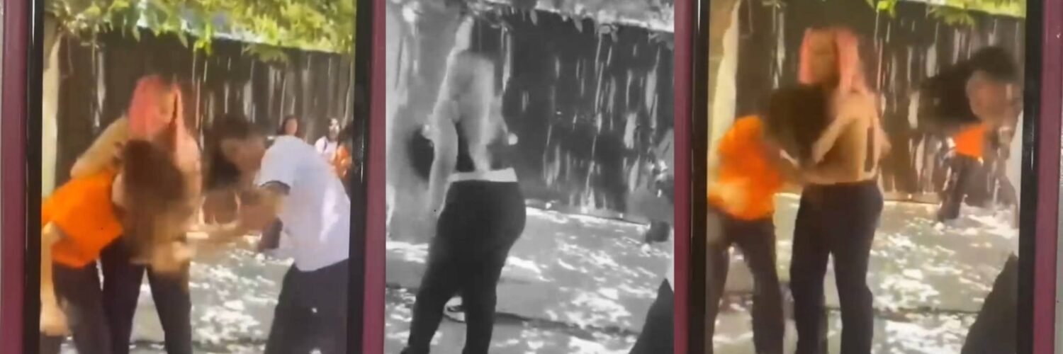 El conflicto escala cuando otras estudiantes se suman, enfrentando a la agresora adulta en una escena caótica, violenta y completamente fuera de control.