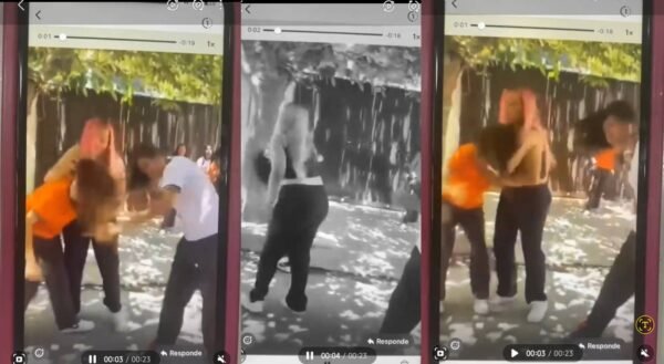 En videos difundidos en redes sociales, se observa a dos jovencitas —una de primer grado y otra de segundo— peleando, mientras alumnos graban sin intervenir. Lo verdaderamente escandaloso ocurre segundos después, cuando una mujer de cabello teñido en rosa se acerca, aparentemente para separar… pero termina golpeando a una de las alumnas.