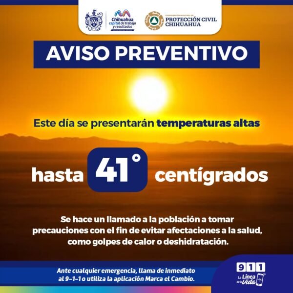 La Coordinación Municipal de Protección Civil informa a la ciudadanía que hoy se prevén temperaturas de hasta 41°C por lo que exhortan a tomar precauciones para cuidar la salud de las familias de un golpe de calor o deshidratación.