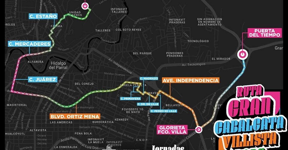 La Cabalgata partirá de la Vía Corta a Chihuahua a la altura de Pemex y se dirigirá hacia la Puerta del Tiempo. Desde allí, los cabalgantes tomarán rumbo a la Glorieta de Francisco Villa, para luego continuar su recorrido por la Avenida Independencia hasta la calle Pedro de Lille. A continuación, girarán en la calle Dr. de Lille, seguirán por la calle Roberto Madrazo y tomarán la calle Primavera hasta llegar al Boulevard Ortiz Mena.