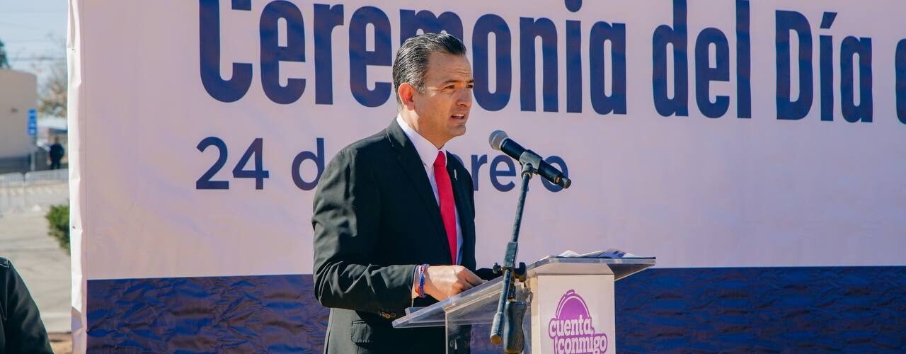 El alcalde de Chihuahua, Marco Bonilla, acompañó a la gobernadora Maru Campos y a autoridades de la Secretaría de la Defensa Nacional (DEFENSA) con motivo del 124 Día de la Bandera, que se celebra el 24 de febrero.