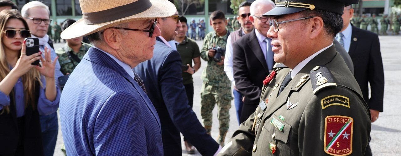 El alcalde de Chihuahua, Jorge Cruz Russek, asistió a la toma de protesta del comandante de la V Zona Militar, general de brigada del Estado Mayor Rubén Zamudio Matías, durante el evento se hizo la posesión del cargo, saludo de los mandos y protesta de la bandera.