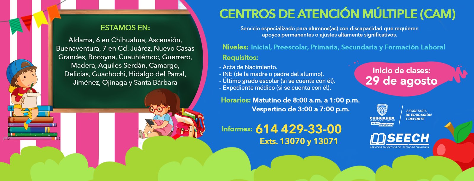Servicios Educativos del Estado de Chihuahua (SEECH), atiende a un total de 29 Centros de Atención Múltiple (CAM), en donde se brinda apoyo a niñas, niños y adolescentes padecen algún tipo de discapacidad y que requieren apoyos permanentes y ajustes altamente significativos.