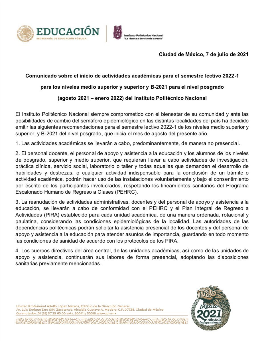 El Instituto Politécnico Nacional (IPN) confirmó que no regresará a clases presenciales hasta enero de 2022. A través de un comunicado, el IPN detalló que las...