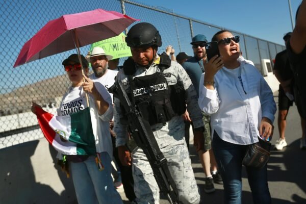 Con pancartas y consignas, los manifestantes se colocaron en la parte alta del cruce internacional, generando largas filas de automovilistas que intentaban cruzar a El Paso.