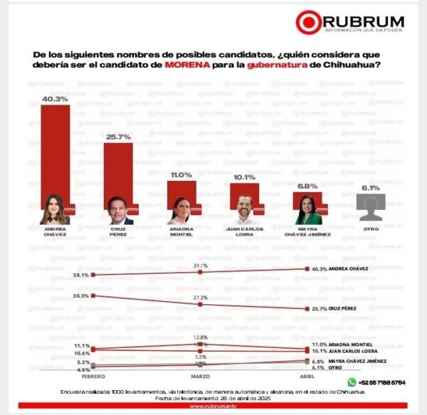 La senadora Andrea Chávez subió en las preferencias electorales al interior de su partido Morena, mientras que el alcalde de Ciudad Juárez Cruz Pérez Cuéllar, presenta una disminución, de acuerdo con la última encuesta de Rubrum del mes de abril.
