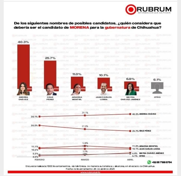 La senadora Andrea Chávez subió en las preferencias electorales al interior de su partido Morena, mientras que el alcalde de Ciudad Juárez Cruz Pérez Cuéllar, presenta una disminución, de acuerdo con la última encuesta de Rubrum del mes de abril.