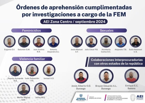 Como parte del trabajo coordinado entre Unidades del Ministerio Público y la Agencia Estatal de Investigación, durante el mes de septiembre se cumplimentaron en la ciudad de Chihuahua, cuatro órdenes de aprehensión por feminicidio, cinco por delitos sexuales y cinco por violencia familiar, cometidos en perjuicio de niñas, adolescentes y mujeres