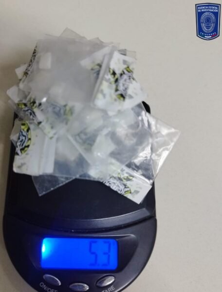 El hombre traía consigo 22 envoltorios de plástico transparente con la estampa de un tigre, que dieron un peso de 5.3 gramos de cocaína en piedra; además de 14 envoltorios de plástico en color rosa, también con la estampa de un tigre, que dieron un peso de 8.7 gramos de cocaína en polvo.