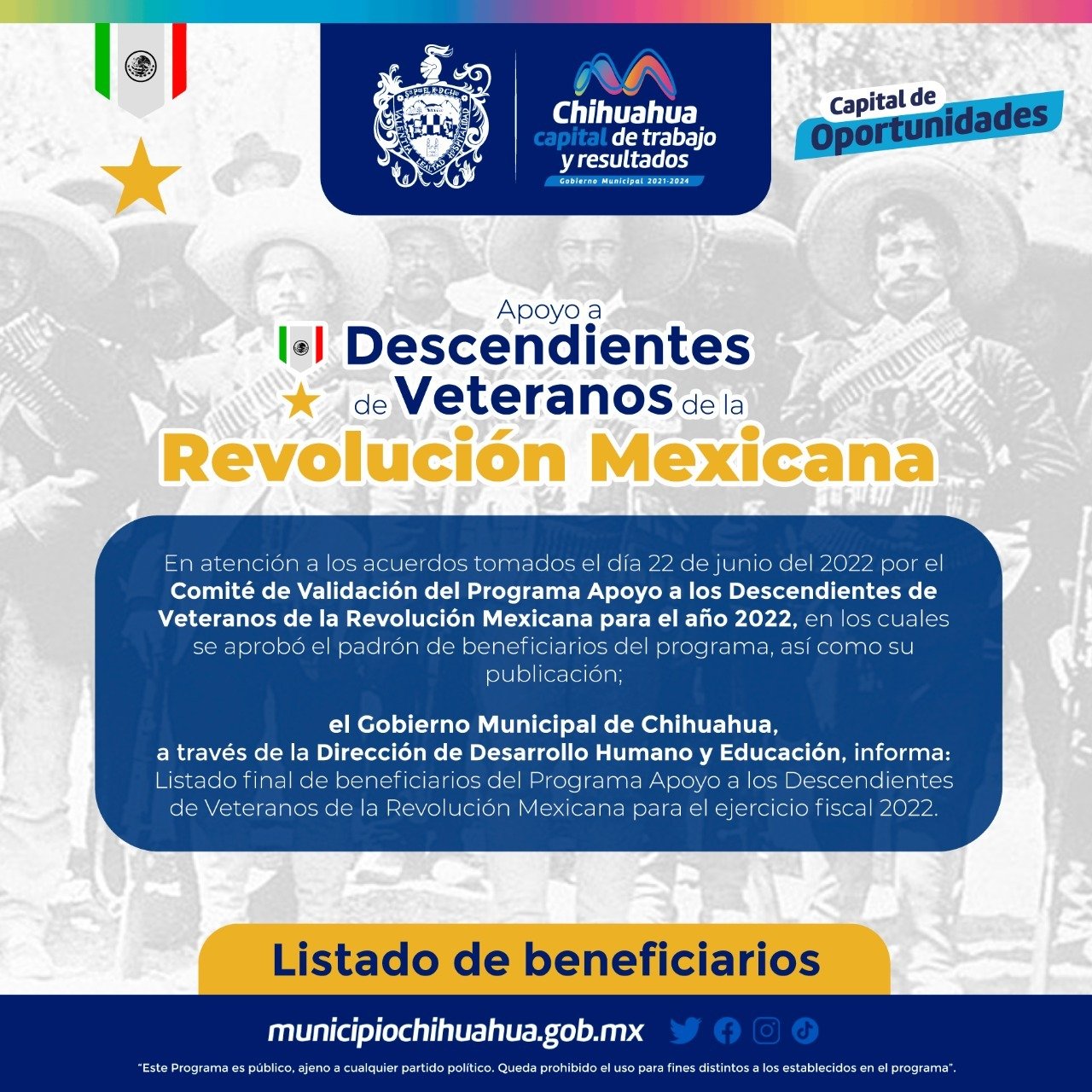 El Gobierno Municipal, a través de la Dirección de Desarrollo Humano y Educación, da a conocer la lista de las y los 78 beneficiarios del “Programa Apoyo a Descendientes de Veteranos de la Revolución Mexicana 2022”.