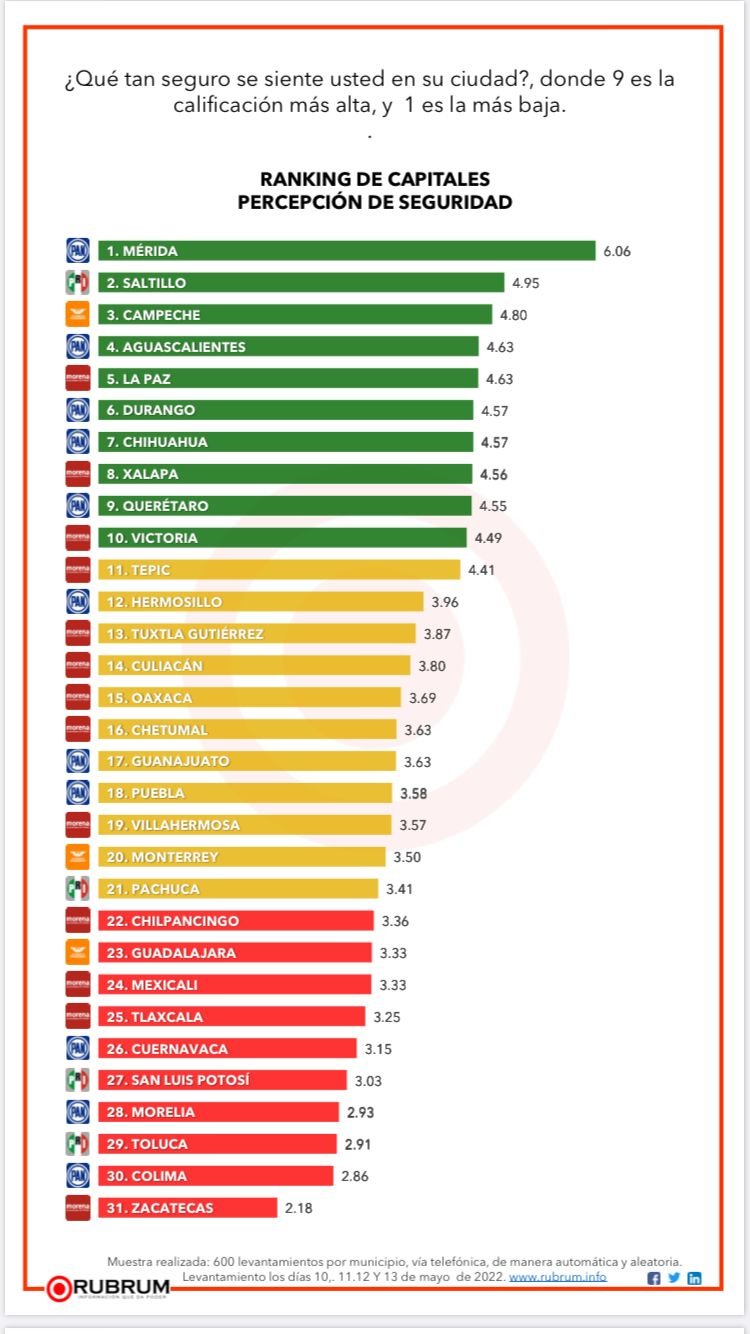 la más baja es 1, los encuestadores marcaron una calificación promedio de 5.9, colocándolo en segundo lugar a nivel nacional, entre 31 homólogos de capitales estatales.
