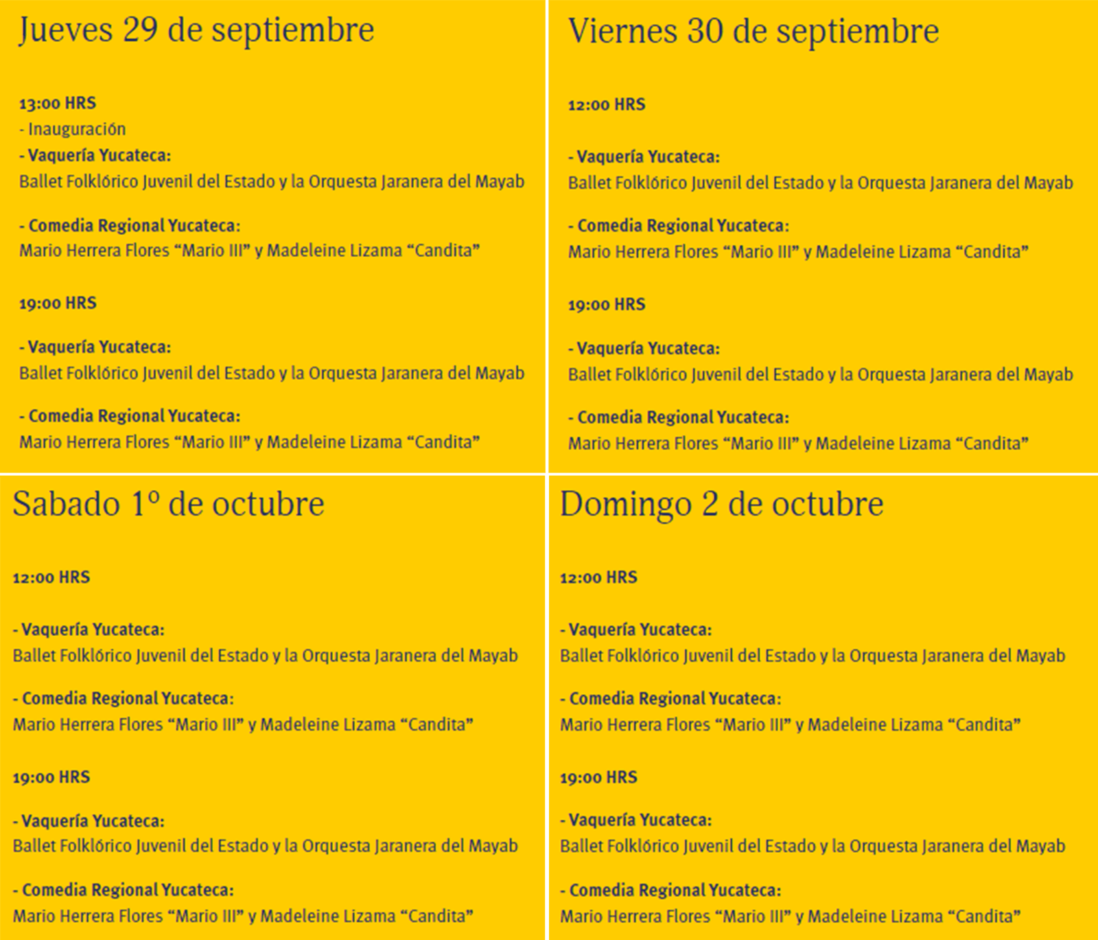 Anteriormente conocido como la Semana de Yucatán en México, y que ahora ha comenzado a recorrer diversos estados, municipios y alcaldías, llevando a otros lugares un pedacito de Yucatán. La finalidad de este evento es mostrar el dinamismo y la riqueza de un estado que crece y busca transformarse y compartir sus tradiciones. Es por ello que los organizadores, invitan a la población en general, a que asistamos, y disfrutemos un poco de las grandes tradiciones, sabores, bordados, ropa, atesanias. O bien que nos atrevamos a probar las salsas más picantes; o disfrutemos de bailar jarana yucateca.