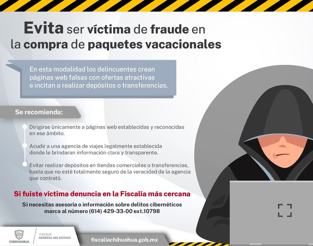Ante la cercanía del periodo vacacional de Semana Santa, la Unidad Especializada en la Investigación de Delitos Patrimoniales de la Fiscalía de Distrito Zona Sur, emite recomendaciones a la ciudadanía contra el delito de fraude cometido a través de compras engañosas de supuestos paquetes vacacionales.