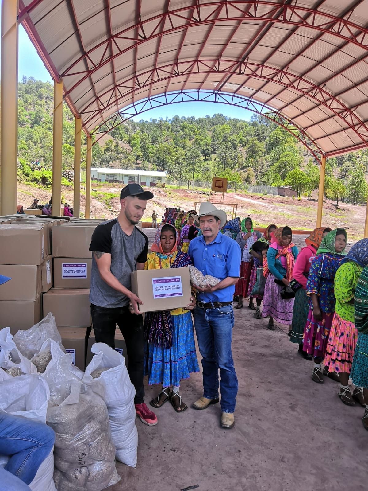 Personal de la Dirección de Alimentación y Desarrollo Comunitario del DIF Estatal entregó 200 despensas y 600 kilos de frijol a pobladores de la comunidad de Rocoroyvo, Municipio de Uruachi.