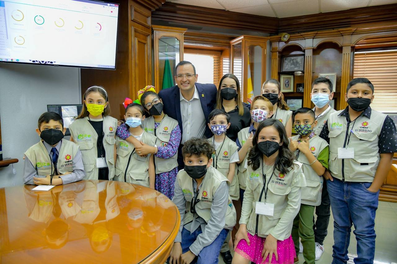 Niñas y niños reporteros acudieron a la Presidencia Municipal para entrevistar al alcalde de Chihuahua, Marco Bonilla, y a la presidenta del DIF Municipal, Karina Olivas, como parte de las actividades que El Heraldo de Chihuahua realiza para festejar el Día de la Niñez.