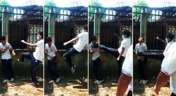En el video, Edgar T, que practica habitualmente Jiu-Jitsu, con su uniforme de la escuela y un cubrebocas, da al menos tres patadas al otro niño.