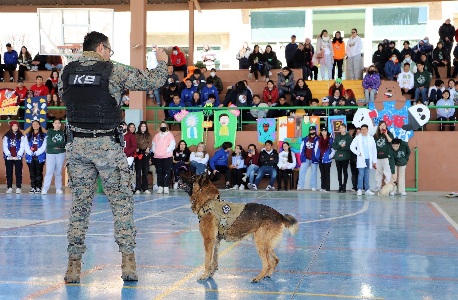 Cientos de estudiantes del Colegio Esfer Salesianos, ubicado al norte de la ciudad, tuvieron la oportunidad de conocer parte del trabajo que realiza el grupo canino K9 de la Dirección de Seguridad Pública Municipal (DSPM), a través de una demostración que realizaron durante un concurso de pasarela de mascotas, organizado dentro del marco de la semana cultural que organiza el Instituto.
