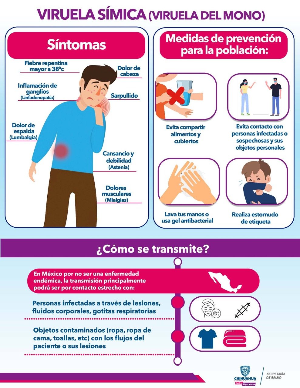 El subdirector de Epidemiología, Gumaro Barrios Gallegos, refirió que la viruela símica no hace distinción entre el sexo y la edad de las personas, también que el contagio se da a través del contacto directo con alguien enfermo, generalmente mediante las lesiones que se generan en la piel o bien por el contacto con los objetos personales.
