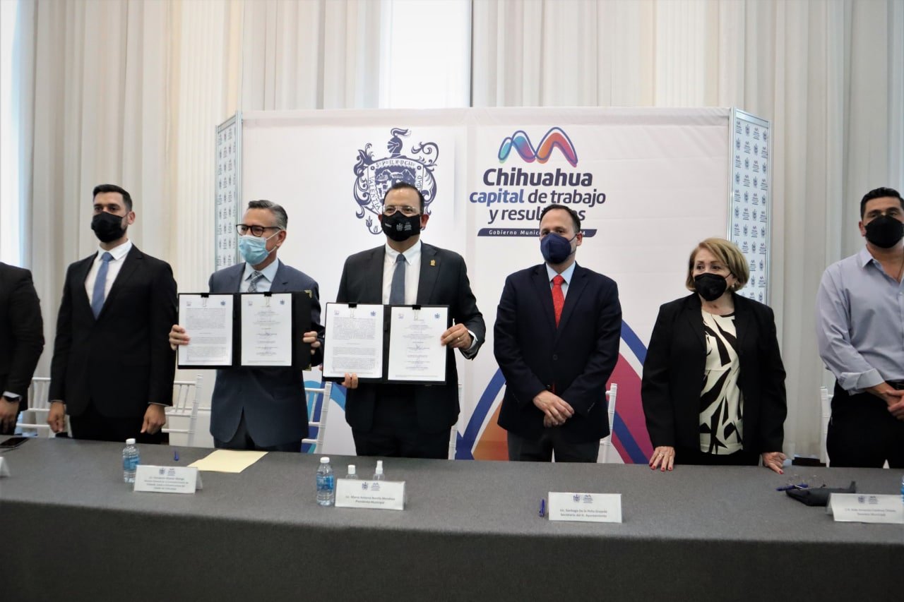 El alcalde de Chihuahua, Marco Bonilla, y el director general de la Comisión Estatal de Vivienda, Suelo e Infraestructura (COESVI), Fernando Álvarez Monje, encabezaron la firma de un convenio de colaboración para apoyar a 2 mil 500 familias en la regularización de sus viviendas y que tengan certeza jurídica de sus hogares.