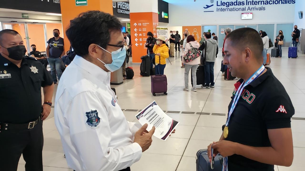 El subsecretario de movilidad, César Komaba Quezada, recibió al agente Ricardo González Muñoz en el Aeropuerto Internacional Roberto Fierro en la ciudad de Chihuahua tras su regreso de la competencia en la que participaron marchistas de todo el mundo.