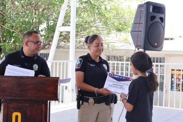 Luego de varias semanas de instrucción por parte de policías municipales, 69 niñas y niños del turno vespertino de la escuela primaria Oscar Soto Máynez, ubicada en la colonia Unidad Cuauhtémoc, se graduaron del curso “Educación para Resistir el Uso de las Drogas y la Violencia”, por sus siglas en inglés D.A.R.E.
