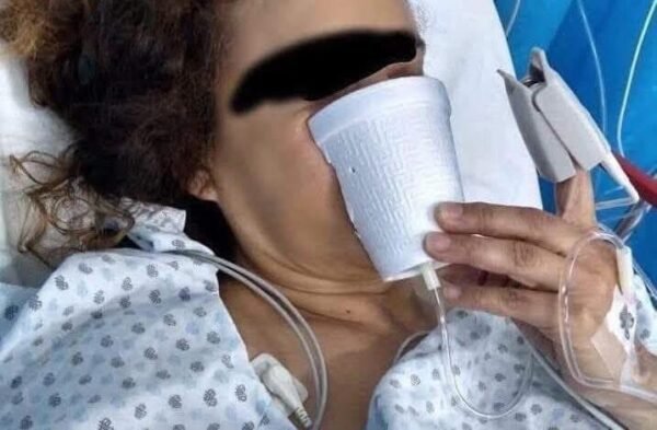 Improvisaron una mascarilla de oxígeno con un vaso de unicel para un paciente con una traqueostomía.