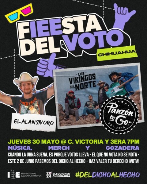 Les invitamos a los eventos de promoción del voto en Chihuahua y Ciudad Juárez. Con la música de Los Vikingos del Norte Oficial y las actividades con los influencers El Alan Sivoro y Panzón To Go.