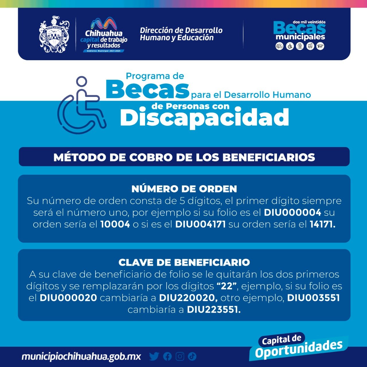 El Gobierno Municipal de Chihuahua, a través de la Dirección de Desarrollo Humano y Educación, inicia este lunes 6 de junio el cobro de apoyo económico del programa de “Becas para el Desarrollo Humano de Personas con Discapacidad 2022”.