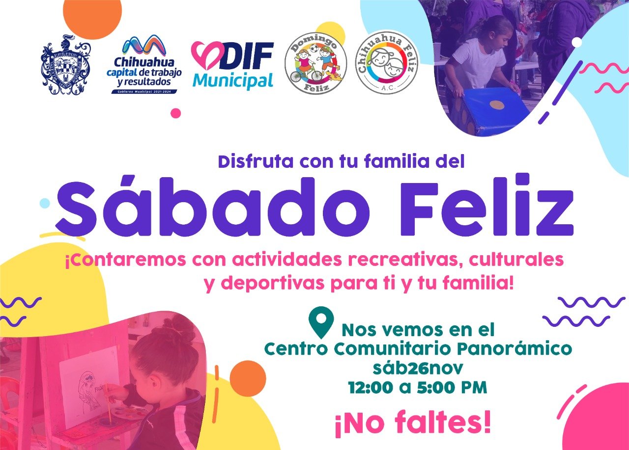 El Gobierno Municipal, a través del DIF y la asociación civil Chihuahua Feliz, invita a las y los chihuahuenses a ser parte del próximo “Sábado Feliz” este 26 de noviembre en el centro comunitario Panorámico, ubicado en calle Lamatepec número 23202, en la colonia Panorámico, con un horario de 12:00 pm a 5:00 pm.