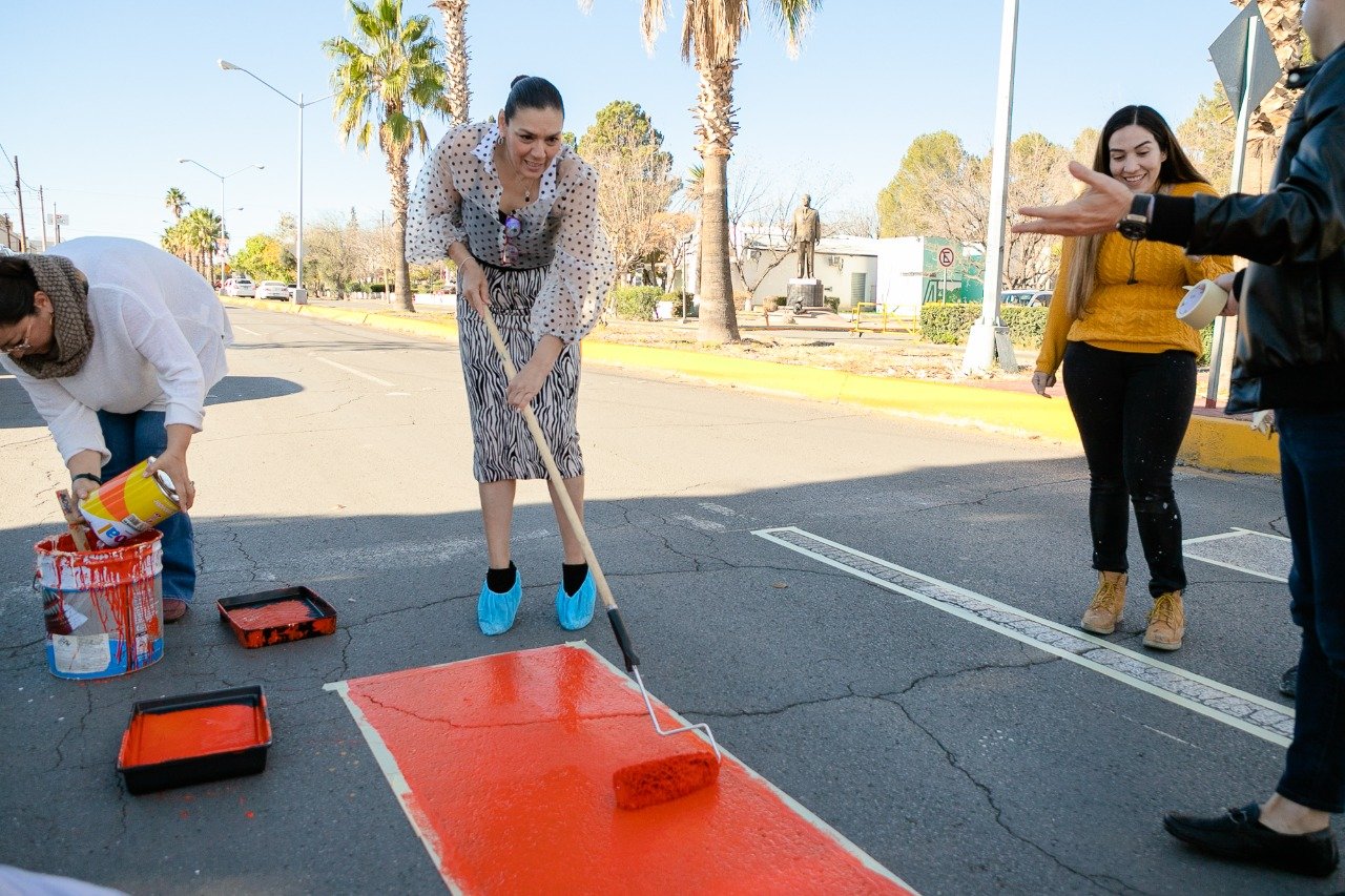 Chihuahua, Chih. – Con el objetivo de recordar a la ciudadanía que el Instituto Estatal Electoral de Chihuahua (IEE) es un punto naranja, donde las mujeres y niñas pueden solicitar ayuda en caso de sentirse inseguras al caminar por ese sector, personal del IEE participó en un cebratón, que consistió en pintar de morado, naranja y blanco el cruce peatonal de la avenida División del Norte y calle 23, justo frente a la institución.