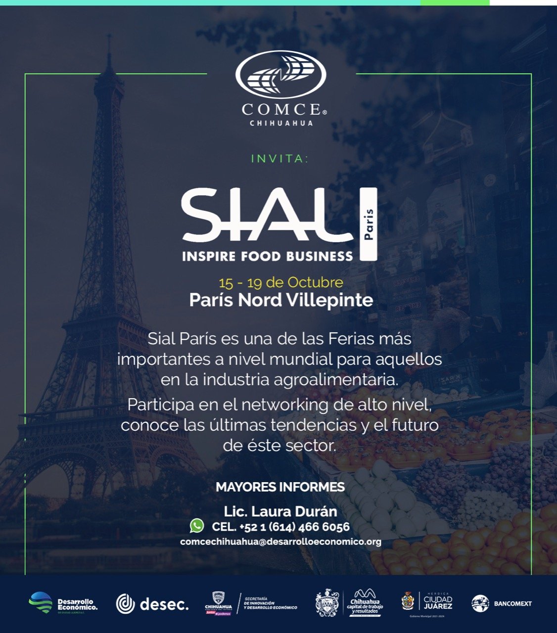 La Secretaría de Innovación y Desarrollo Económico, en alianza con el Consejo Mexicano de Comercio Exterior de Chihuahua (COMCE), Desarrollo Económico del Estado de Chihuahua (DESEC), Desarrollo Económico de Ciudad Juárez (DECJ), Bancomext y los municipios de Ciudad Juárez y Chihuahua, invitan a empresas chihuahuenses a participar en SIAL Paris 2022, una de las ferias de la industria agroalimentaria más importantes en el mundo.