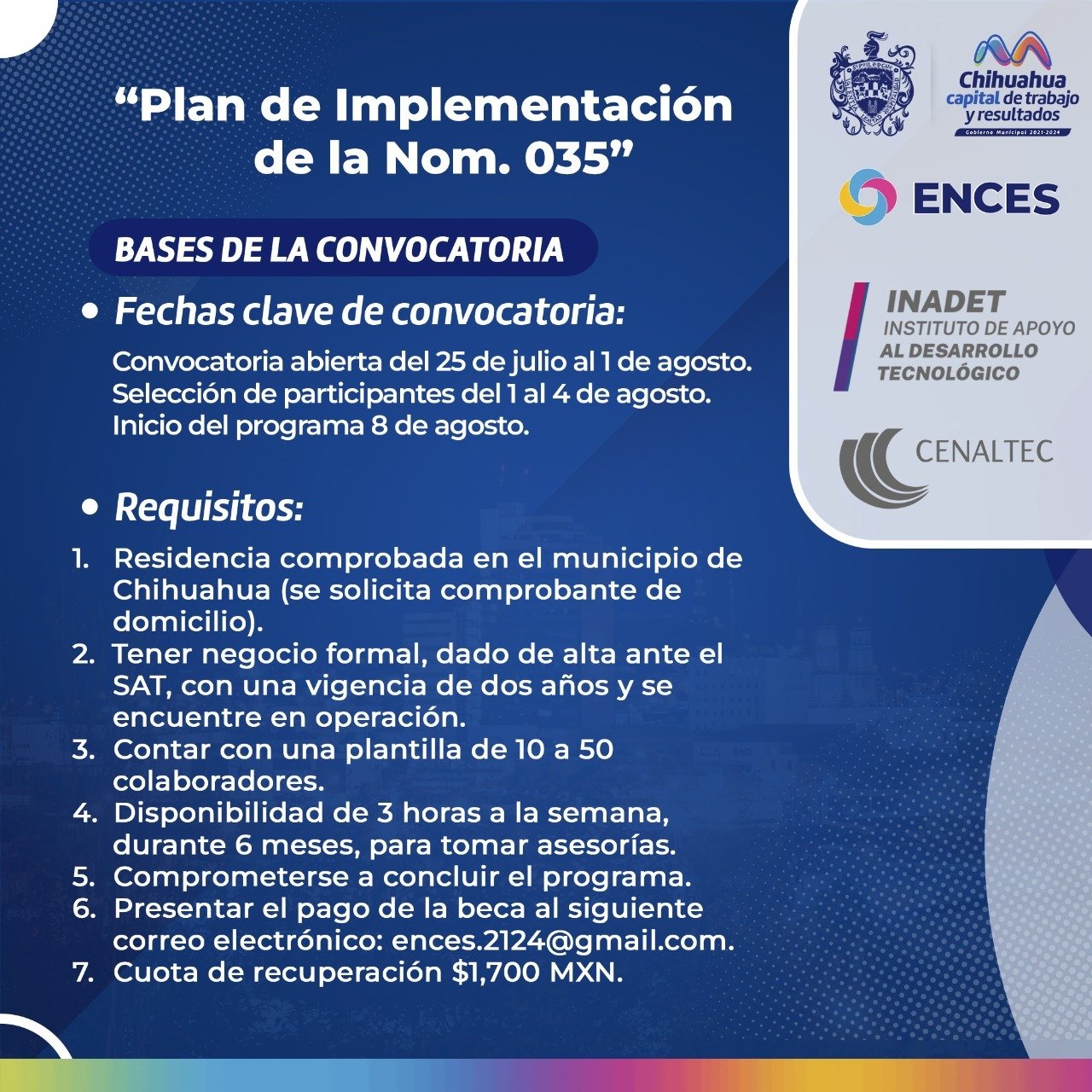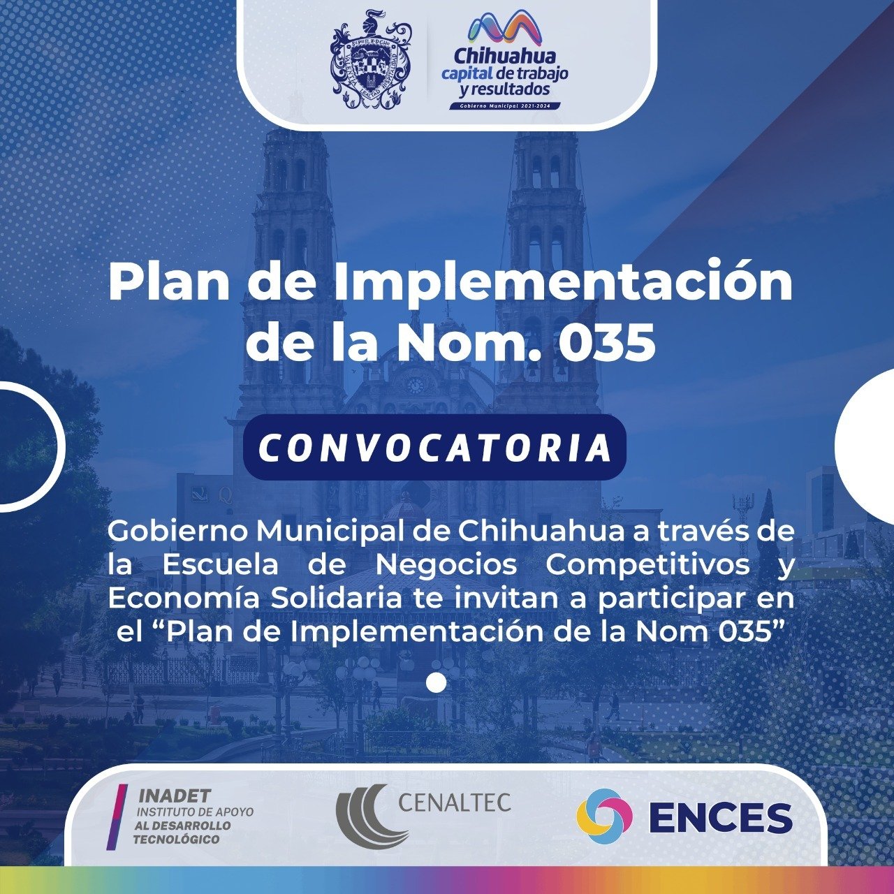 El Gobierno Municipal de Chihuahua y la Escuela de Negocios Competitivos y Economía Solidaria (ENCES), en una inversión conjunta de 435 mil pesos con el Instituto de Apoyo al Desarrollo Tecnológico (INDAET) de Gobierno del Estado, invitaron a las micro, pequeñas y medianas empresas (MIPYMES) a participar en la convocatoria “Plan de Implementación de la NOM 035”.