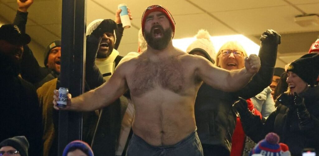 No importa que la temperatura en Buffalo esté bajo cero si tu hermano anota un touchdown en un juego de Ronda Divisional, por lo menos eso fue lo que pudo pensar el recién retirado Jason Kelce, quien dejó una imagen viral este domingo en el juego entre los Kansas City Chiefs y los Buffalo Bills de los Playoffs.