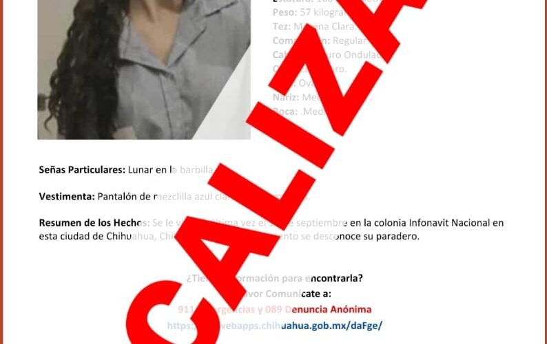 De la misma forma, se localizó a Nahomi Sherlyn M. M. de 19 años de edad, quien de acuerdo al reporte interpuesto el pasado martes 16 de septiembre, se ausentó desde el 05 de agosto del 2025 en la colonia Cordilleras.