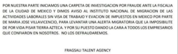 La agencia que la contrató para dar firmas de autógrafos y otros eventos; Fragsali Talent Agency, publicó un comunicado donde el equipo de trabajo expresó con justa razón todas sus inconformidades con Maria José Villavicencio, luego de todos los acontecimientos recientes, entre ellos comentarios negativos e irrespetuosos hacia las personas empleadas pertenecientes a la comunidad LGBT, como drags y personas trans, prestándole servicios para su vestuario; incluyendo maquillaje, peinado, uñas, etc.
