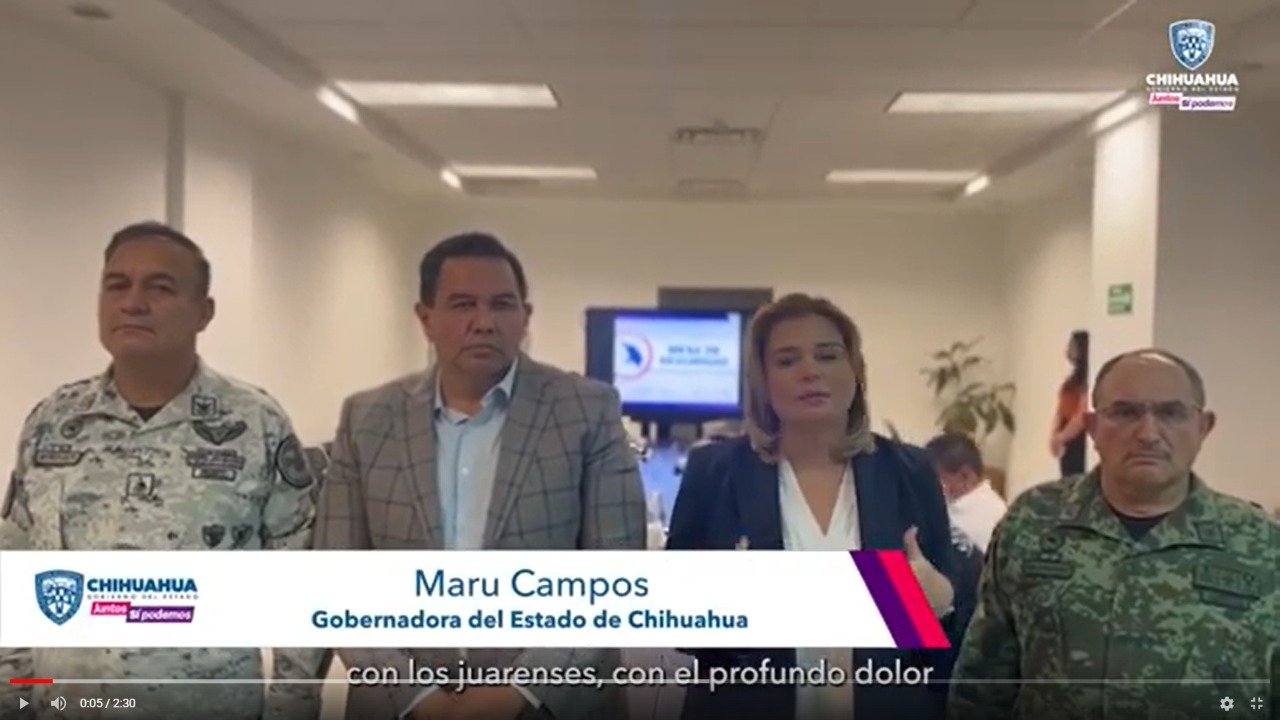 Mensaje de Gobernadora por atentados ocurridos en Cd. Juárez, no nos vamos a rendir para alcanzar la paz en esta ciudad no vamos a dar un paso atrás y trabaremos al límite de nuestras capacidades y para concluir les pido que estemos atentos de los medios de comunicación en torno a lo que sucede en esta frontera.