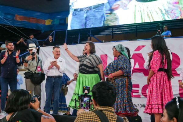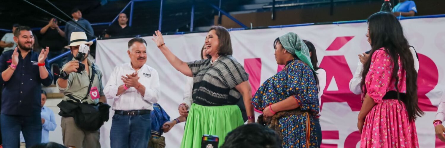 Ahí la candidata recibió un traje de la etnia tarahumara, que le fue obsequiado por mujeres de la sierra tarahumara y ante ellas se comprometió a seguir trabajando como presidenta por los pueblos originarios.