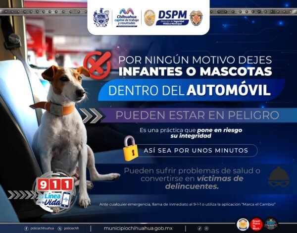 El Gobierno Municipal a través de la Dirección de Seguridad Pública y del Heroico Cuerpo de Bomberos y Rescate, pide a las y los chihuahuenses no dejar en el interior de los automóviles infantes o mascotas, aunque sea por un momento, ya que pueden causar problemas a su salud o pudieran convertirse en el blanco de personas mal intencionadas.
