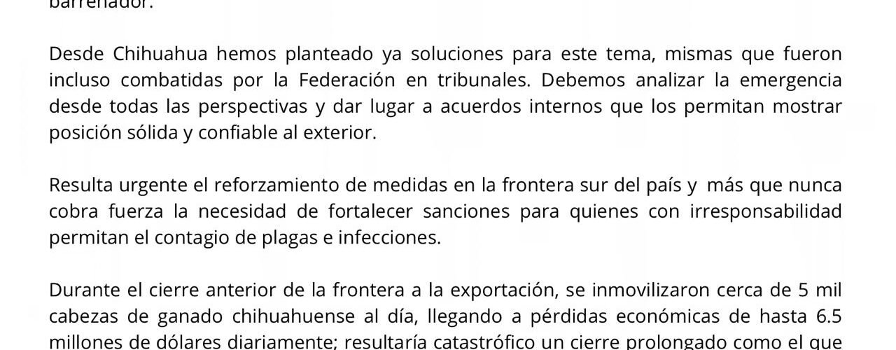 Exigimos acciones inmediatas de la federación y trabajo coordinado con los estados y productores para plantear una solución que parta de compromisos multilaterales y evaluaciones realistas sobre la situación que enfrentamos por la proliferación del gusano barrenador.