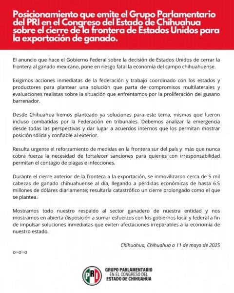 Mostramos todo nuestro respaldo al sector ganadero de nuestra entidad y nos mostramos en abierta disposición a sumar esfuerzos con los gobiernos local y federal a fin de impulsar soluciones inmediatas que eviten afectaciones irreparables a la economía de nuestro estado.