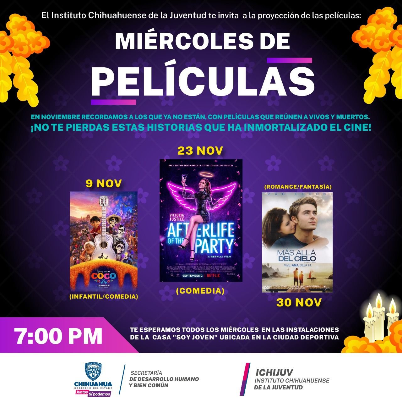 El Gobierno del Estado, a través del Instituto Chihuahuense de la Juventud (ICHIJUV), proyectará películas con temática del Día de Muertos, los miércoles de noviembre en la Casa Soy Joven, ubicada en la Ciudad Deportiva, a partir de las 7:00 de la tarde.