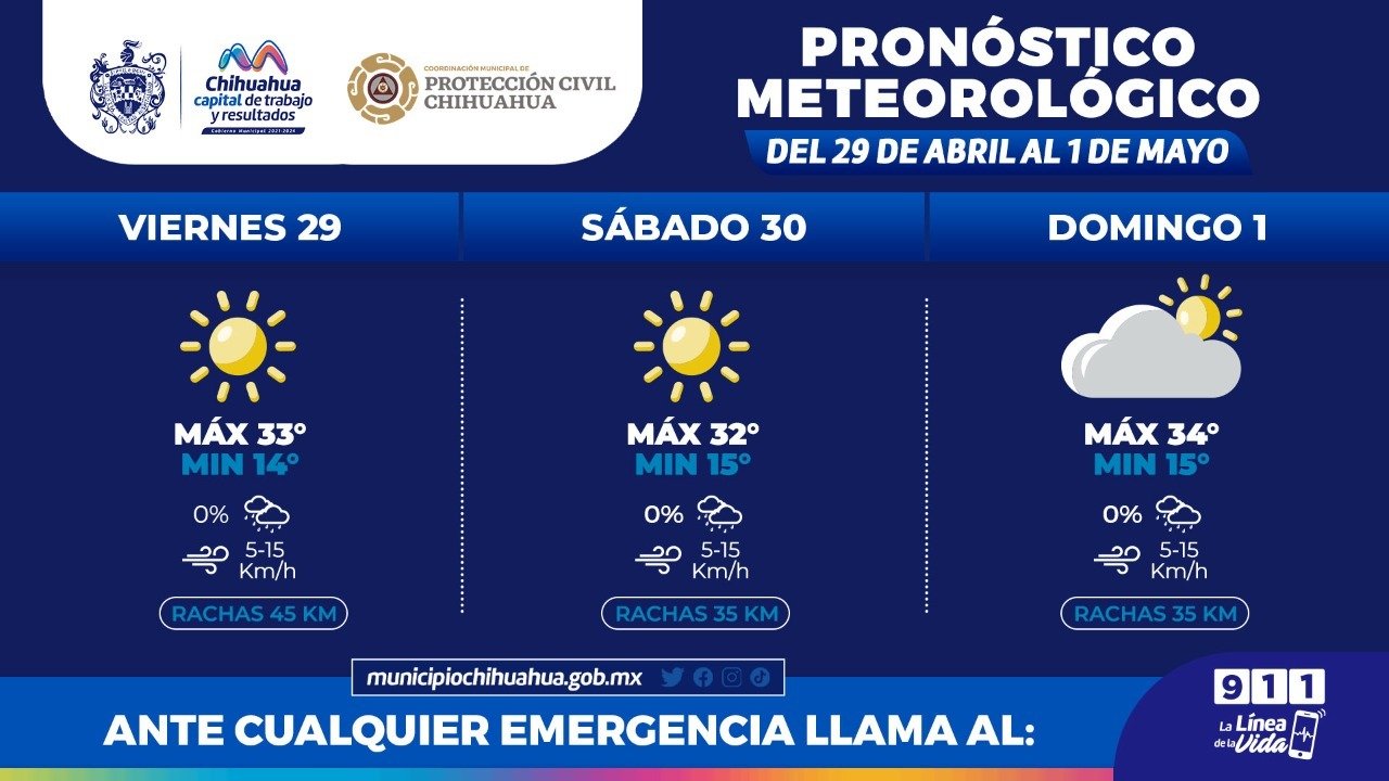 De acuerdo al pronóstico que emite el Servicio Meteorológico Nacional de CONAGUA, para este viernes se espera una máxima de 33°C y una mínima de 14°C, con vientos de hasta 45km/h con un cielo mayormente soleado. Por otra parte, para el sábado la máxima será de 32°C y la mínima de 15°C, con vientos de hasta 35km/h y sin posibilidad de lluvia para ambos días.