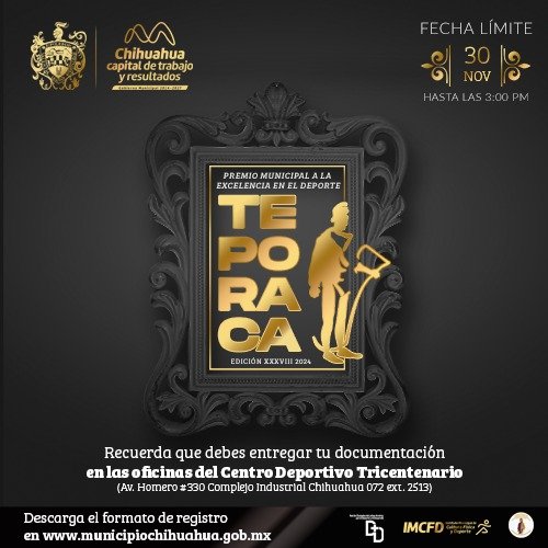 Las bases de la convocatoria, así como el formato de registro las podrán consultar en la página oficial del Gobierno Municipal de Chihuahua: https://www.municipiochihuahua.gob.mx/CCS/Convocatorias/Premio_Municipal_a_la_Excelencia_en_el_Deporte_Teporaca_2024.