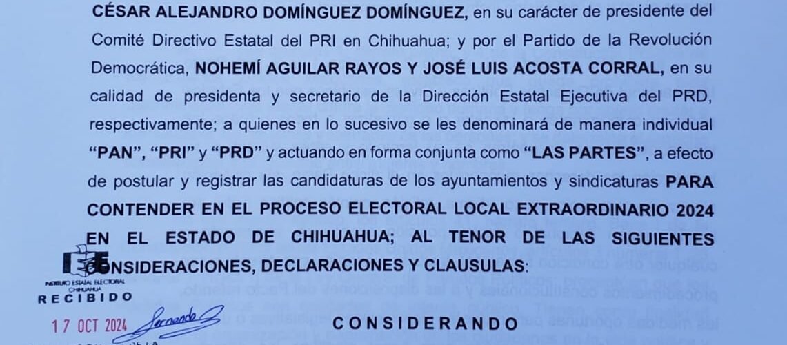 Cabe mencionar que el convenio validado ante el órgano electoral del estado registró fecha del 17 de octubre, y fue firmado por Gabriel Diaz Negrete dirigente de Acción Nacional, Nohemí Aguilar Rayos por el Partido de Revolución Democrática, y el diputado priista Alejandro Domínguez Domínguez.