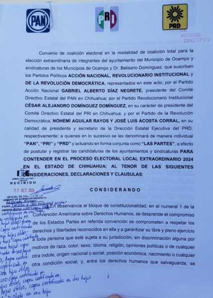 Las dirigencias estatales del PRI, PAN, y PRD ratificaron ante el Instituto Estatal Electoral su convenio de coalición de cara a la elección extraordinaria para la alcaldía y sindicatura del Municipio de Ocampo, además de la sindicatura de Belisario Domínguez; misma que tendrá lugar el 8 de diciembre del presente año, dio a conocer el líder priista Alejandro Domínguez.