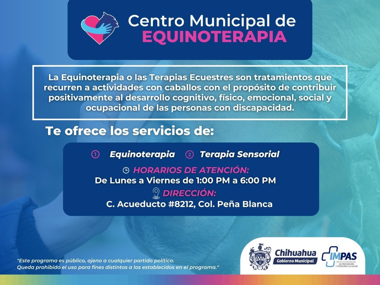 El Gobierno Municipal de Chihuahua, a través del Instituto Municipal de Prevención y Atención a la Salud (IMPAS), informa a la ciudadanía, así como a sus usuarias y usuarios, el regreso a las actividades y servicios presenciales del Centro Municipal de Equinoterapia.