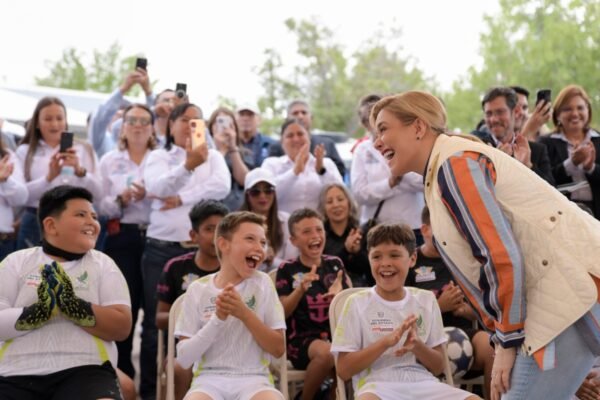 En Janos, con una “cascarita” la mandataria inauguró una cancha de futbol 7×7 con pasto sintético en la escuela Porfirio Talamantes, donde además distribuyó mobiliario educativo para otros 10 planteles, como butacas, pizarrones, aires, tinacos y luminarias.