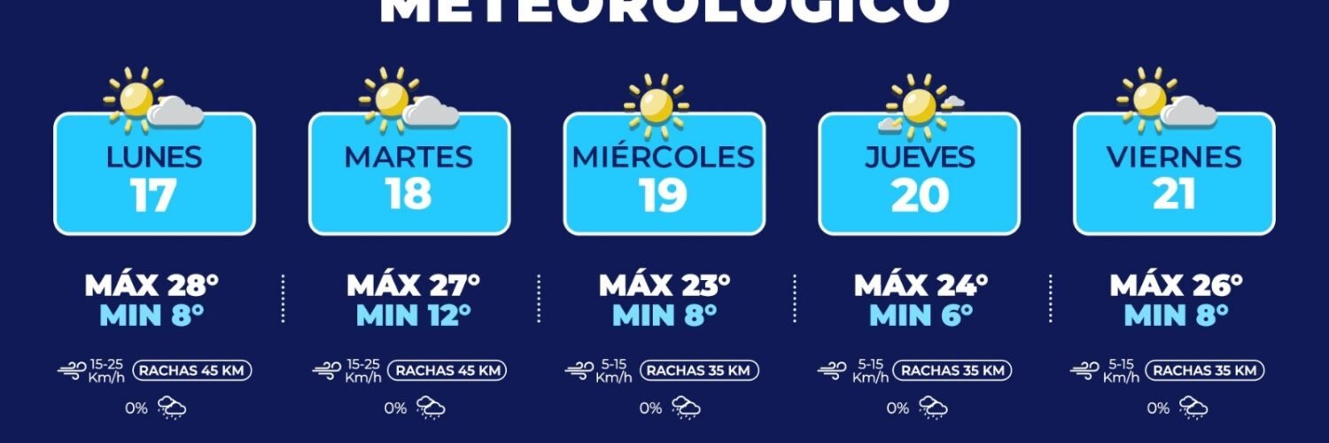 La Coordinación de Protección Civil Municipal informa que para esta semana se pronostican temperaturas máximas de hasta 28°C con mínimas de 8°C, además, para este lunes y martes se registrarán vientos ligeros de 15 a 25 kilómetros por hora, con rachas de hasta 45 km/h.