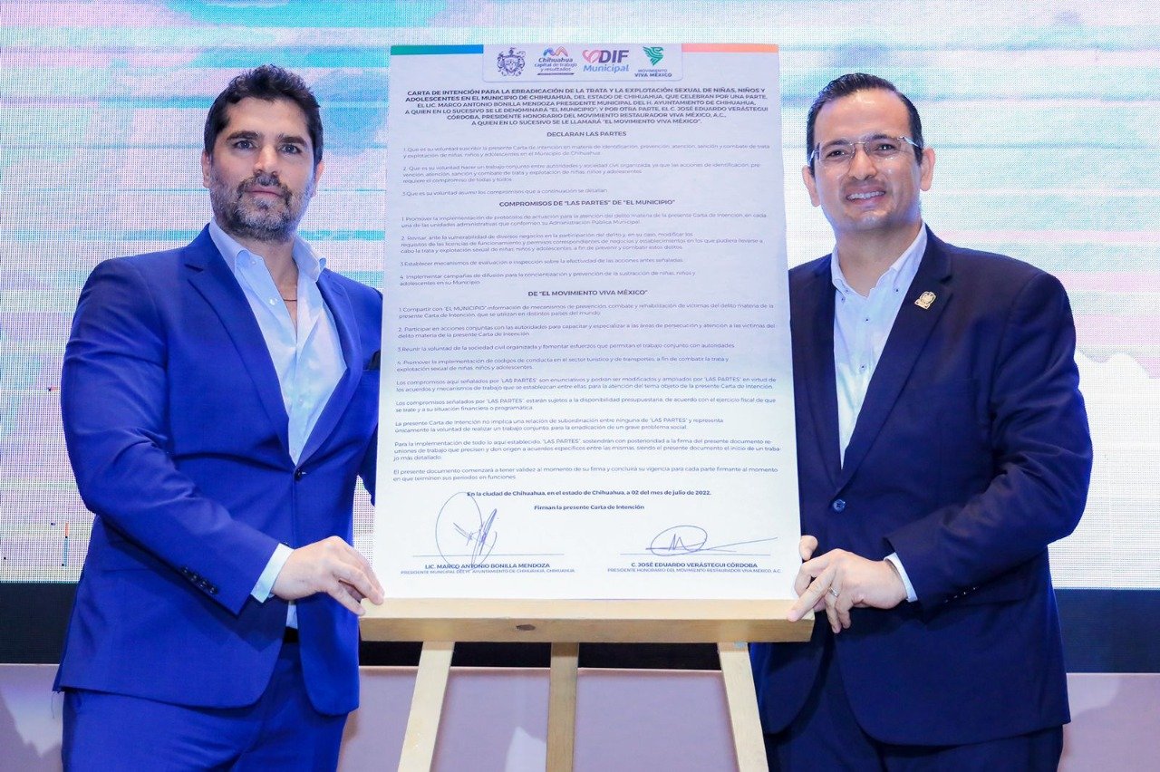 Marco Bonilla, alcalde de Chihuahua, encabezó la firma de una carta compromiso con la asociación civil “Movimiento Viva México”, para hacer frente a esta problemática; a fin de reforzar las medidas y acciones que el Gobierno Municipal lleva a cabo para proteger los derechos de las niñas, niños y adolescente de la Capital y para velar por el bienestar de las familias chihuahuenses.